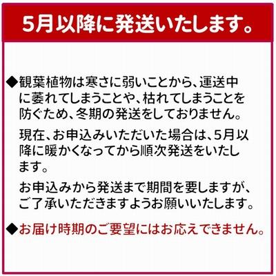 商品情報 お礼品詳細 ・配送方法:通常 ・提供事業者:株式会社やさい農園 ・提供元:南九州市 お申し込み・配送・その他 ・発送時期:2024年5月以降、順次発送 ※観葉植物は寒さに弱いことから、運送中に萎れてしまうことや枯れてしまうことを防ぐため、冬期のお届けはできません。冬期は発送を見合わせ、暖かくなってからお届けいたします。予めご了承くださいませ。 ・申込受付期間:通年 ・配達外のエリア: ・寄付証明書の送付時期目安:申込完了日から1週間程度 |
